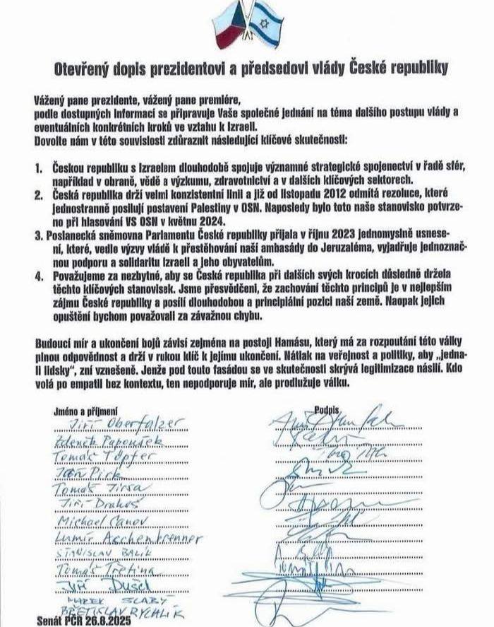Pod otevřeným dopisem je podepsaná skupina třinácti senátorů, mezi nimi je i liberecký senátor Michael Canov (STAN/Starostové pro Liberecký kraj), ale například i Tomáš Töpfer (ODS) či Břetislav Rychlík (TOP 09 s podporou Pirártů a Zelených). Dopis reaguje na očekávané jednání prezidenta Petra Pavla s premiérem Petrem Fialou (ODS) o situaci na Blízkém východě.